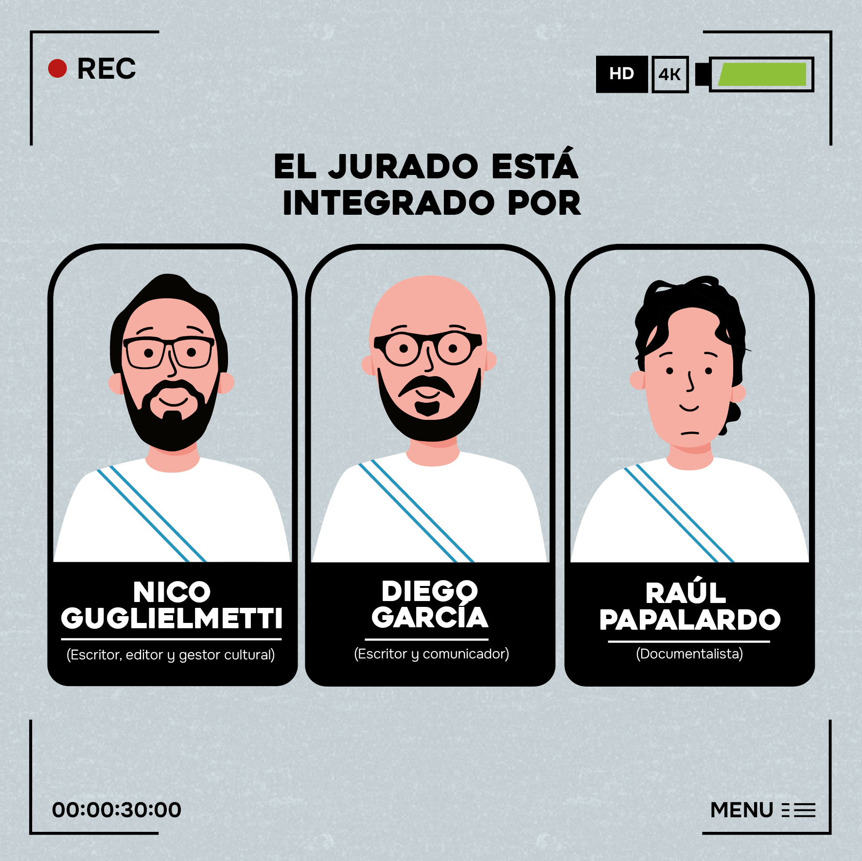 En archivo adjunto enviar una reseña biográfica que incluya foto, nombre y apellido, domicilio, mail y celular de contacto. En caso de tener publicaciones o trabajos vinculados a la literatura o el cine ponerlo en la bio también.