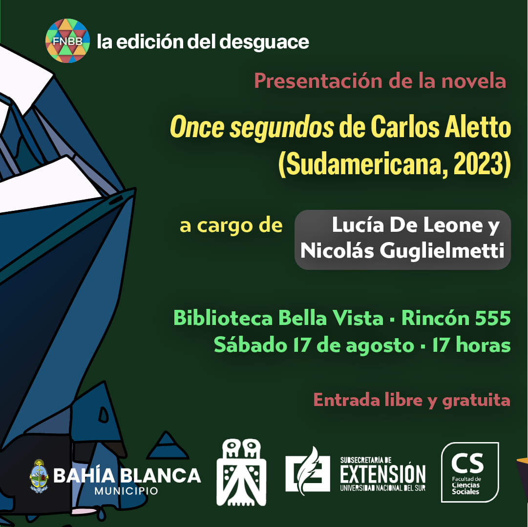 Por otra parte, Aletto va a presentar por primera vez en la ciudad la novela Once Segundos, editada por Sudamericana en 2023, en la cual, con el gol de Maradona a los ingleses como telón de fondo, cuenta los devenires de unos pibes que gambetean la pobreza sin más armas que la escritura, gracias a unos libros que encuentran en un basural. Este texto de Aletto ha recibido las mejores devoluciones tanto de destacados periodistas como Victor Hugo Morales a reconocidos pares que lo ayudaron en su construcción, como Claudia Piñeiro y Guillermo Saccomano; además de los mismos próceres jugadores del equipo campeón de México 86.