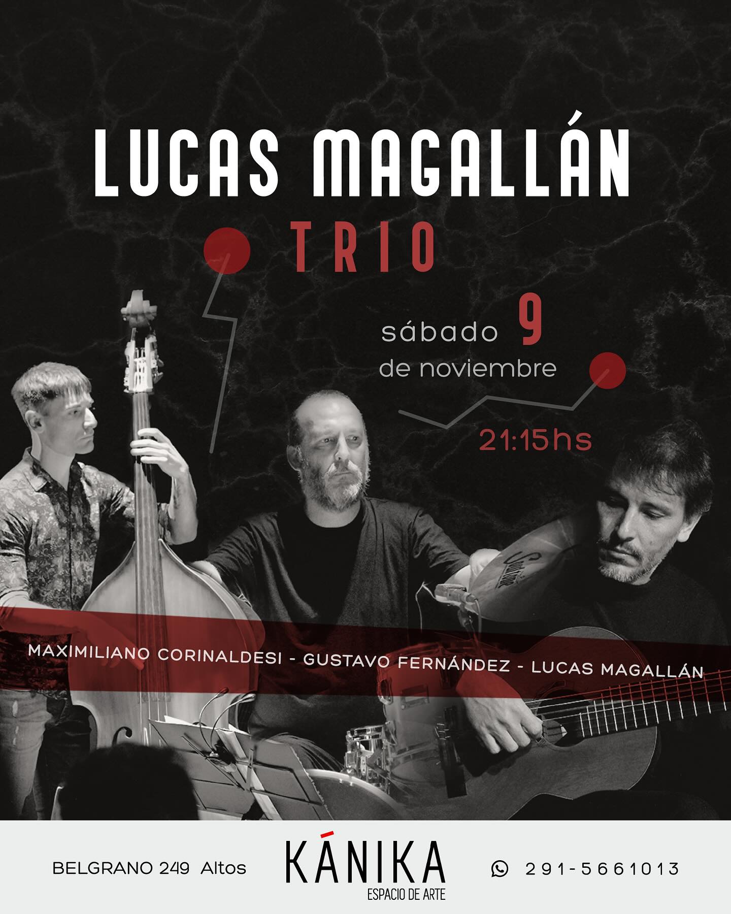 El trío Lucas Magallán, integrado por Lucas Magallán en guitarra, Maxi Corinaldesi en contrabajo y Gustavo Fernandez en batería, se presenta en concierto invitándonos a compartir músicas de raíz folclórica,